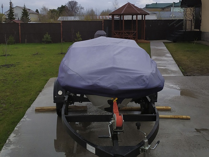 Легкость установки и надежность крепления: По низу чехла идет резинка с утяжкой, что позволяет легко и быстро устанавливать и фиксировать его на лодке.